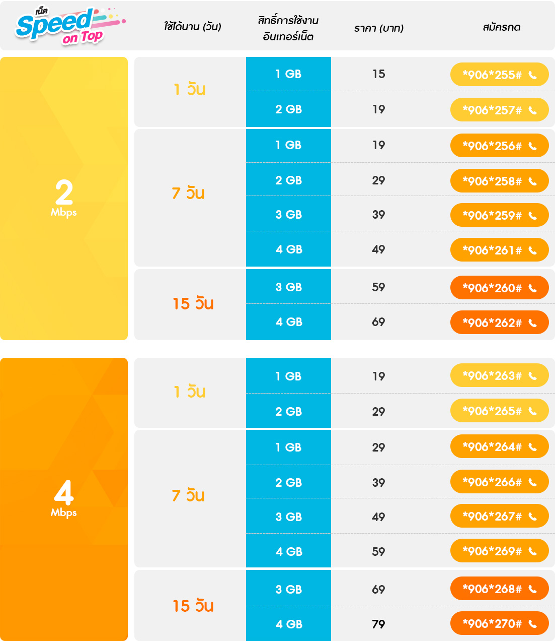- ค่าใช้บริการส่วนเกินจากแพ็กเกจเสริมจะถูกคิดตามอัตราแพ็กเกจหลักที่ใช้อยู่ในขณะนั้น